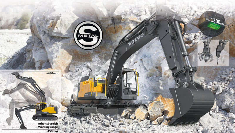 La pelleteuse Volvo EC160E métal radio-commandée 2.4GHz 1/16 Jamara 406300 est un superbe et puissant engin de chantier RC livré prêt à rouler.