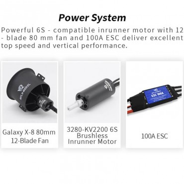 L'Alpha Jet est équipé d'une turbine électrique Galaxy X-8 12 pales 80mm qui excelle à la fois à haute et basse vitesse. Alimenté par une batterie Li-Po 6S, un puissant moteur Brushless, et un contrôleur 100A, il offre de grosses performances avec une réponse à l'accélération quasi instantanée, une excellente vitesse de pointe, des performances verticales et un son de type turbine incroyable.